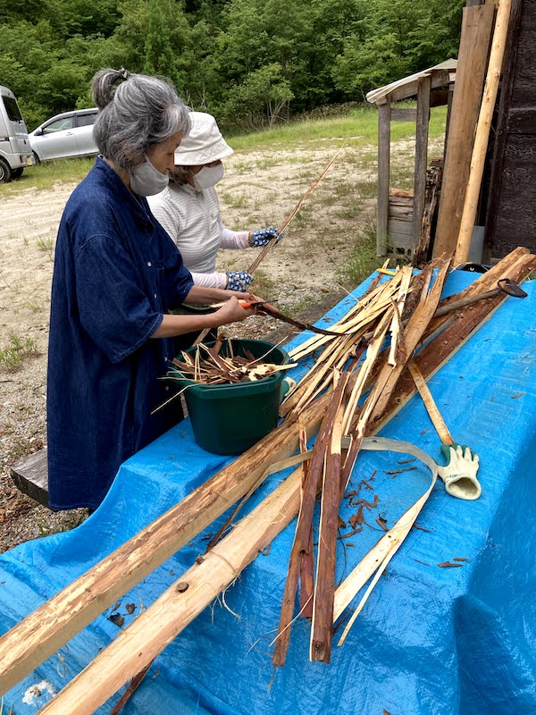 どうやら、ヒノキの皮を染料に使う算段の様子。 なんでも赤い色に染まるとか。