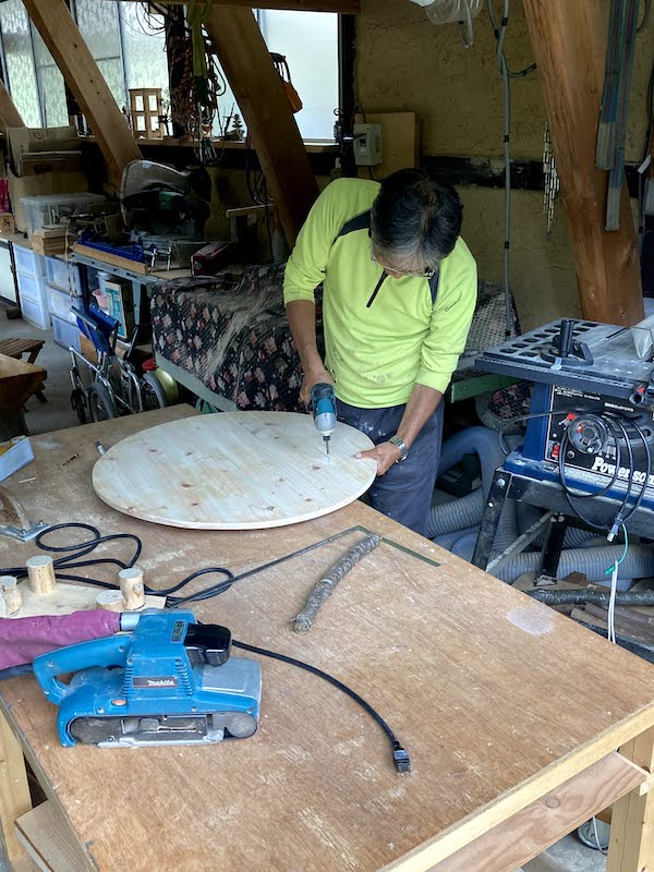 ニワケンさんは、岩村のHYAKKEIで使う五右衛門風呂の蓋をヒノキで製作。